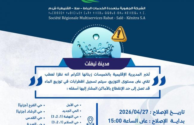 عبد العالي بوعرفي – تيفلت بريس أعلنت المديرية الإقليمية بالخميسات، التابعة للشركة الجهوية متعددة الخدمات الرباط – سلا – القنيطرة