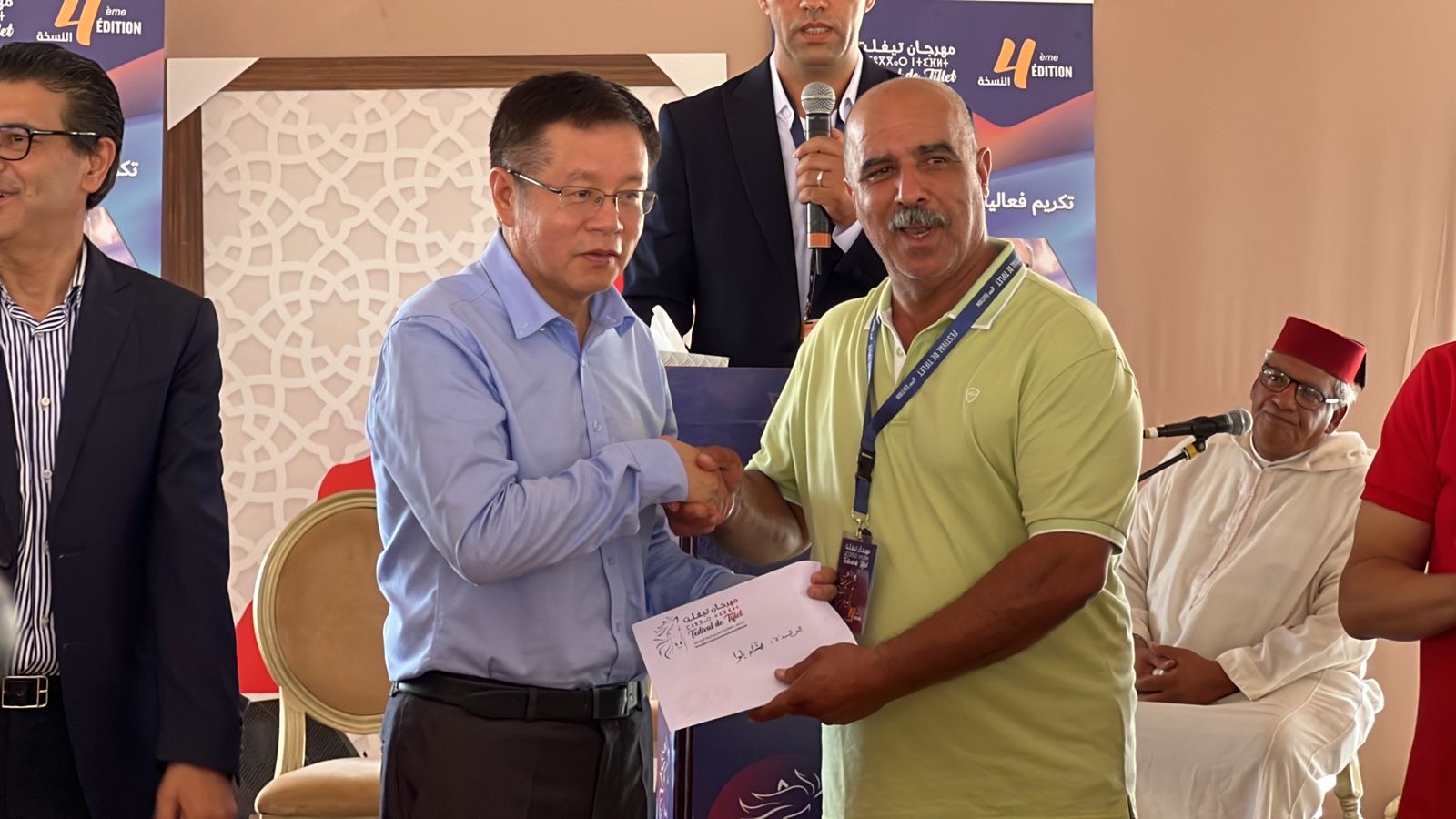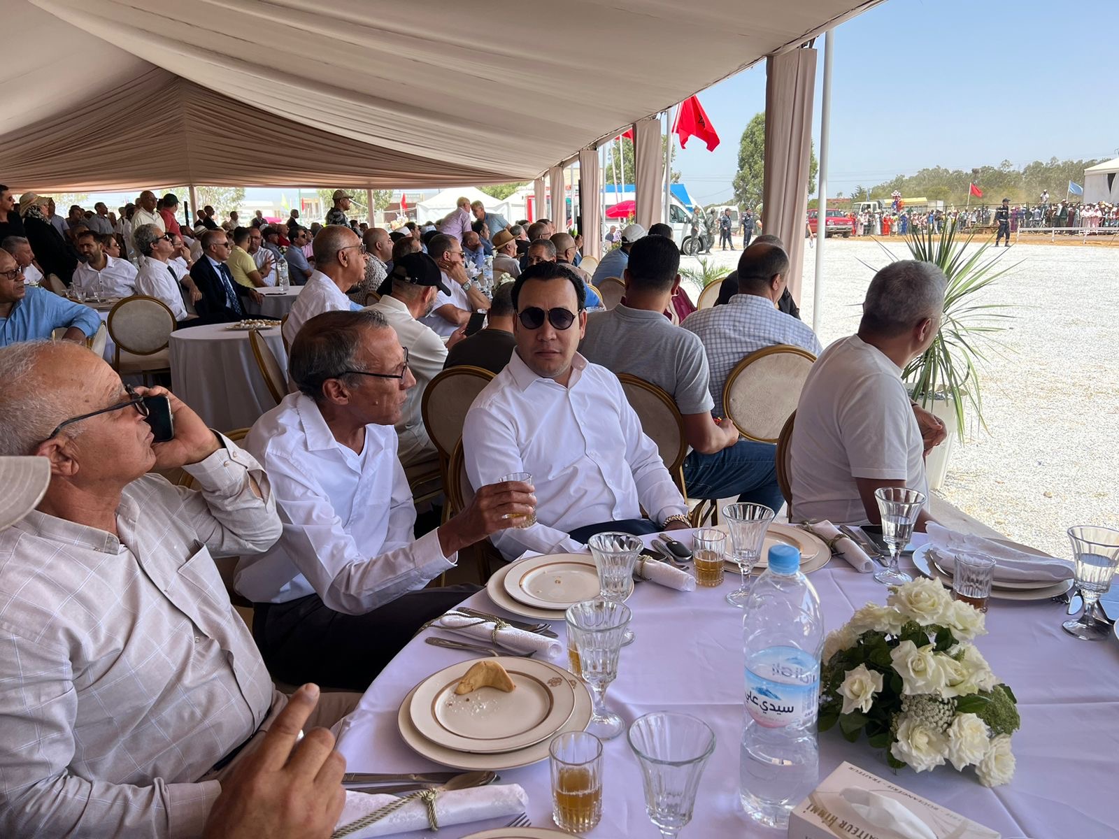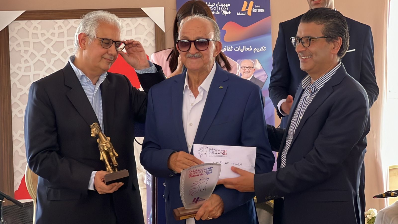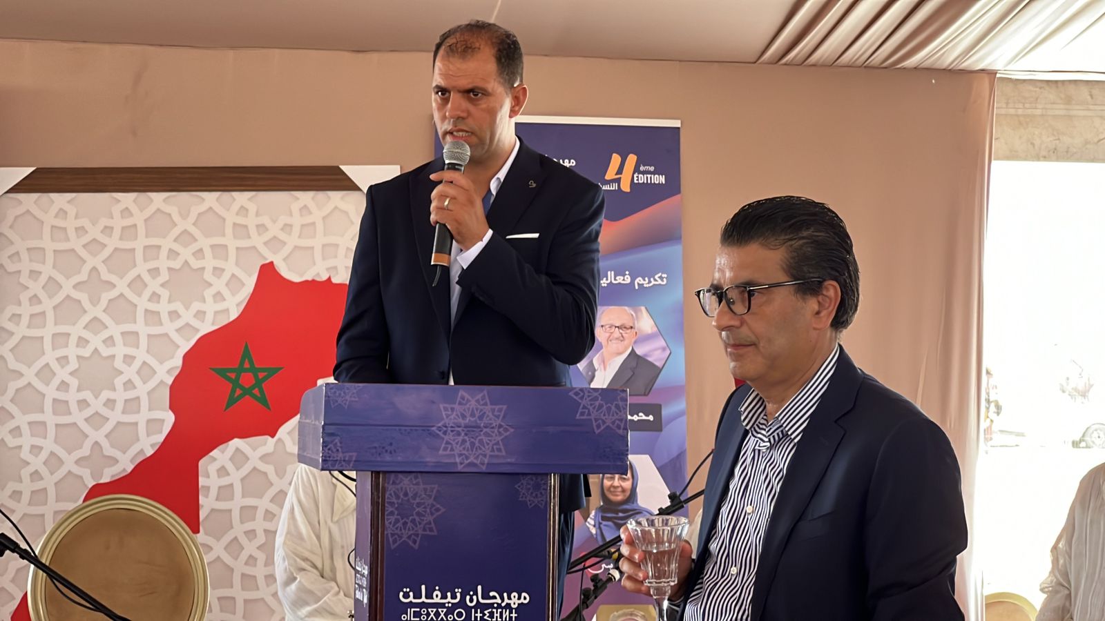 احتضنت المنصة الشرفية المقامة بحلبة التبوريدة الحفل الرسمي لمهرجان تيفلت في نسخته الرابعة المنظم من طرف جمعية أطلس زمور تيفلت بشراكة مع المجلس الجماعي تحت شعار “الثقافة في خدمة ورش الدولة الاجتماعية” ظهر اليوم السبت 27 يوليوز 2024 , هذا الحفل المميز أقيم على شرف ضيوف المهرجان والذين كان على رأسهم وزير التجهيز والماء نزار بركة ووزير الادماج الاقتصادي والمقاولة الصغرى و التشغيل يونس السكوري وعامل اقليم الخميسات منصور قرطاح وسفراء كل من دولة فلسطين والمملكة الأردنية الهاشمية والصين الشعبية والمندوب السامي للمقاومة وجيش التحرير ورئبس جهة الرباط سلا القنيطرة ورئيسة المجلس الإقليمي والعديد من الامناء العامين للاحزاب ومجموعة من النائبات والنواب البرلمانيين والعديد من رؤساء الجماعات والمنتخبين ورؤساء المصالح الخارجية ورجال السلطة المحلية وشخصيات مدنية وعسكرية بالإضافة إلى مجموعة من الفنانين المغاربة الذين حلوا بمدينة تيفلت لمشاركة الساكنة احتفالاتها .