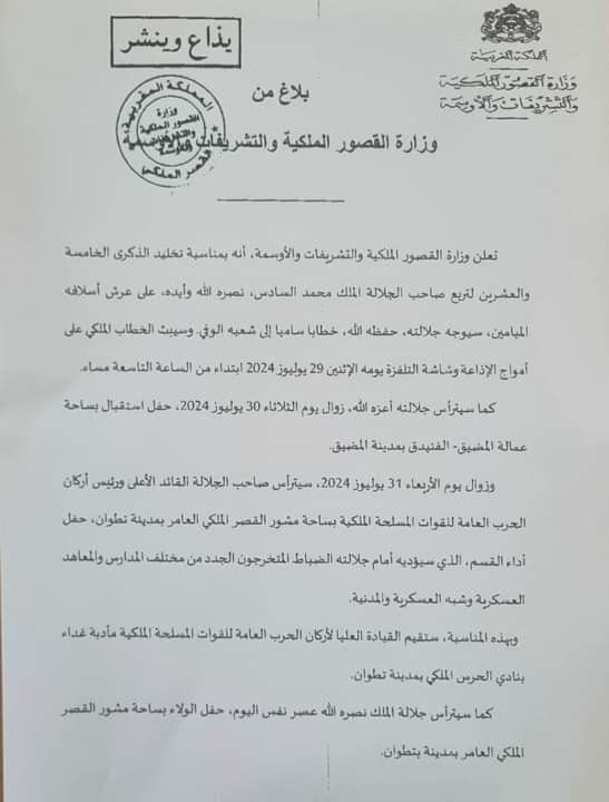تعلن وزارة القصور الملكية والتشريفات والأوسمة، أنه بمناسبة تخليد الذكرى الخامسة والعشرين لتريع صاحب الجلالة الملك محمد السادس، نصره الله وأيده على عرش أسلافه الميامين سيوجه جلالته، حفظه الله، خطابا ساميا إلى شعبه الوفي. وسيبت الخطاب الملكي على أمواج الإذاعة وشاشة التلفزة يومه الإثنين 29 يوليوز 2024 ابتداء من الساعة التاسعة مساء، كما سيترأس جلالته أعزه الله زوال يوم الثلاثاء 30 يوليوز 2024، حفل استقبال بساحة عمالة المضيق الفنيدق بمدينة المضيق.