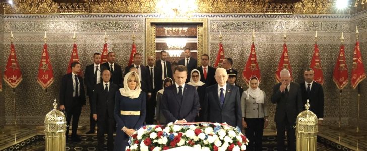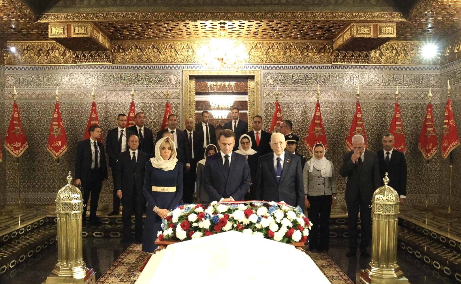 قام الرئيس الفرنسي، فخامة السيد إيمانويل ماكرون، وحرمه السيدة بريجيت ماكرون، اليوم الثلاثاء، بزيارة لضريح محمد الخامس، حيث ترحما على روحي جلالة المغفور لهما الملك محمد الخامس والملك الحسن الثاني، طيب الله ثراهما.