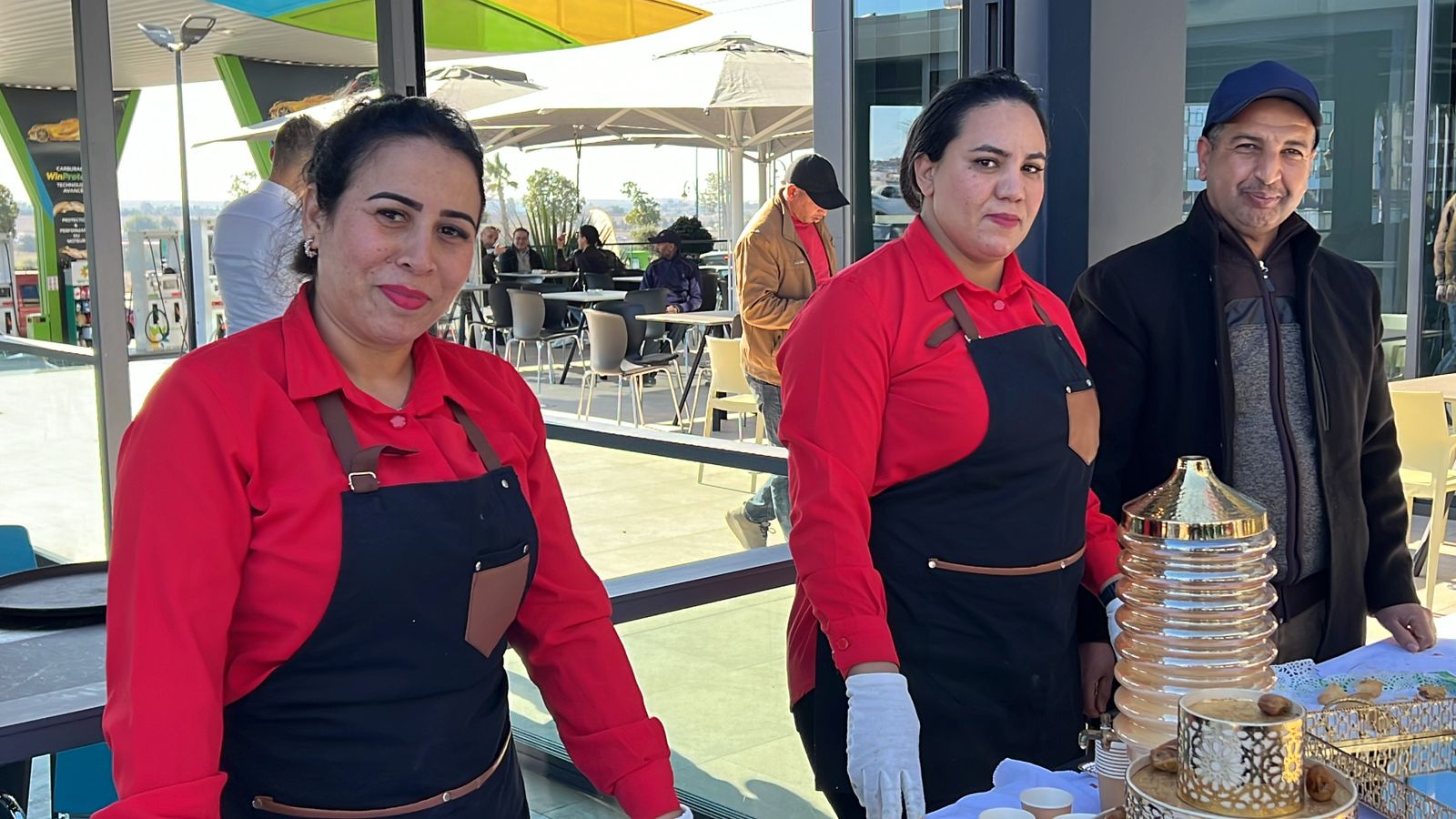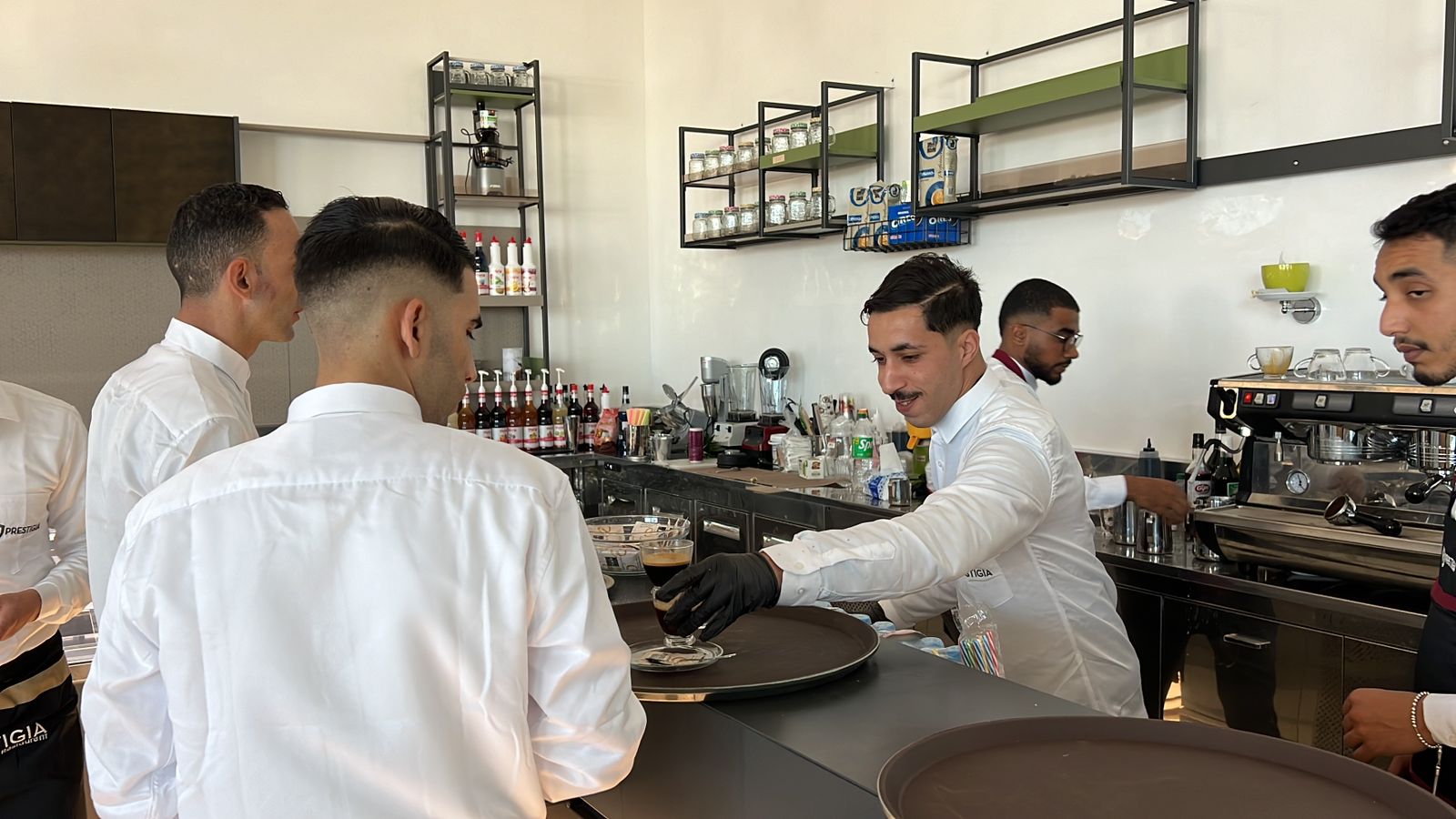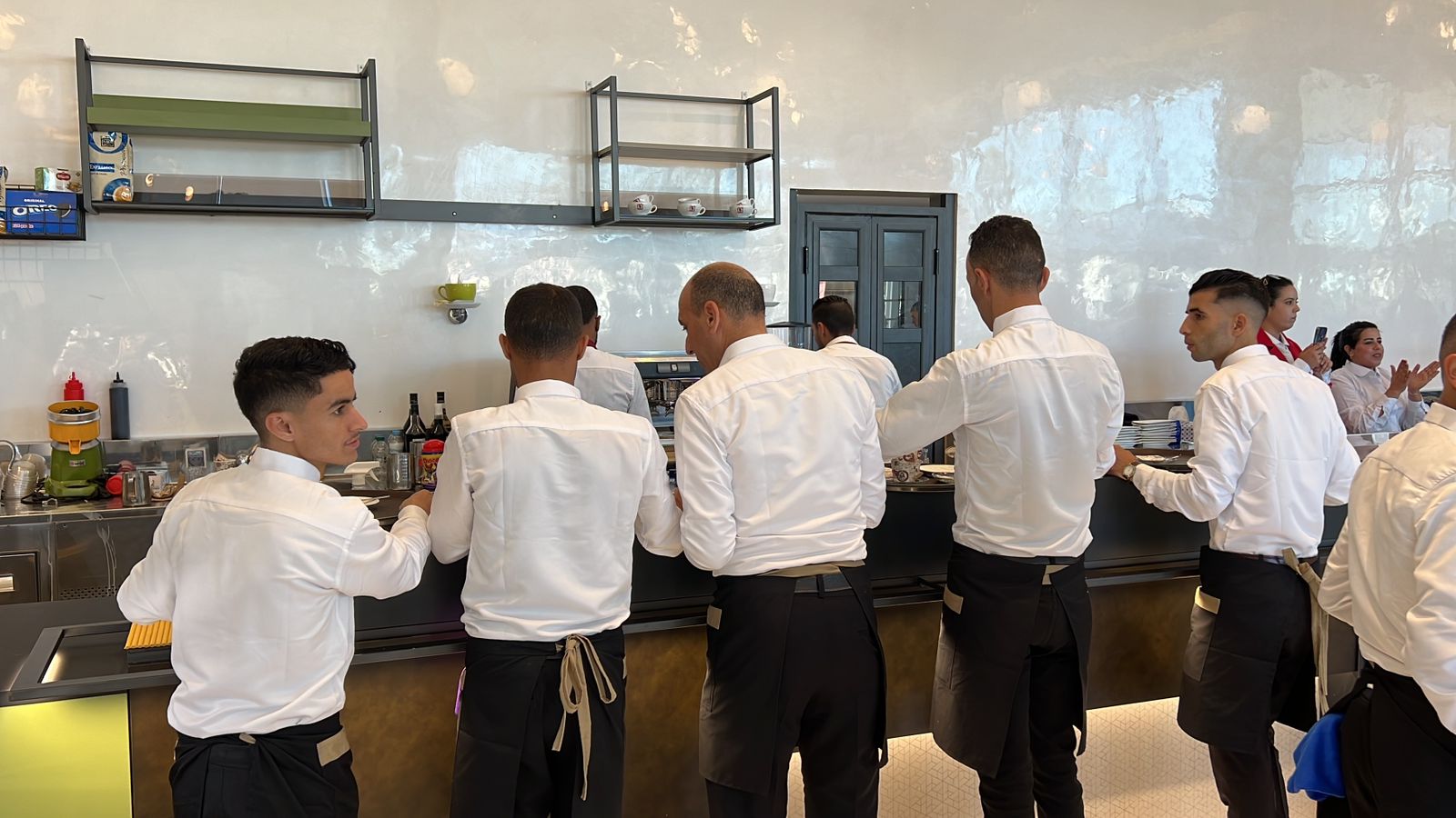 ويشتغل بالمقهى طاقم جاهز ومستعد لخلق الفضاء المناسب للزبناء الباحثين عن الراحة الكاملة، ولكل العائلات الراغبة في الترويح عن النفس.