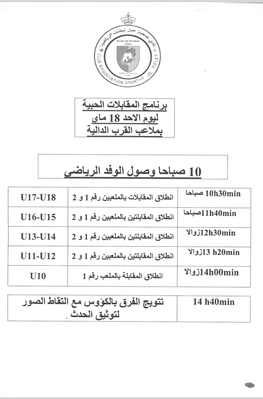وإليكم برنامج الدوري الذي سيعرف مشاركة أربع فرق من جمعية جيل تيفلت الرياضية و 4 فرق من جمعية الرياضة والصداقة الدار البيضاء
