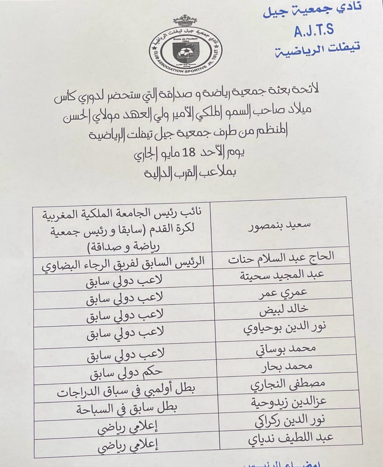 وسيعرف هذا الاحتفال حضور جمعية الرياضة والصداقة الدار البيضاء ممثلة بالأسماء التالية