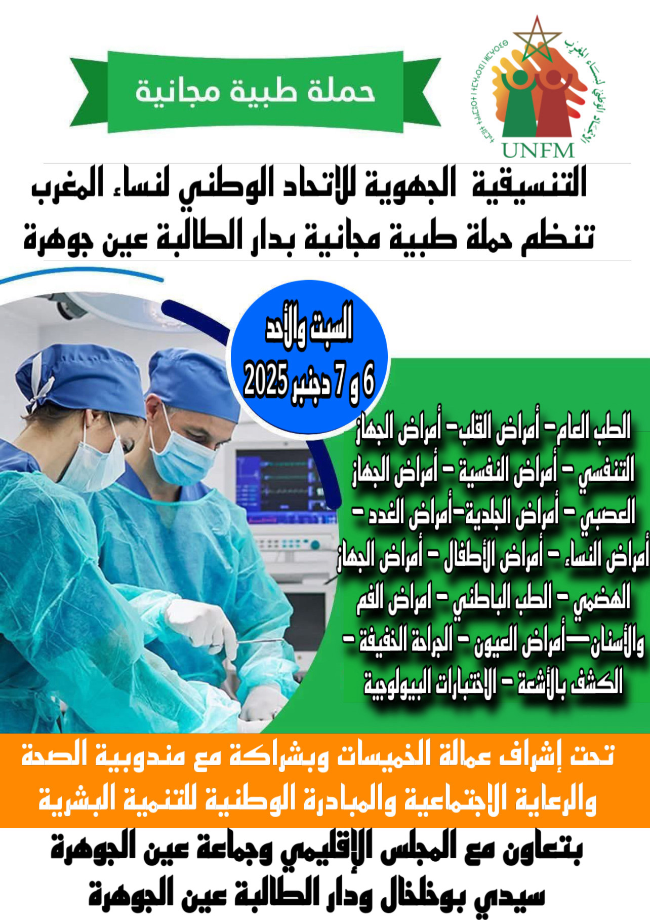 انسجاما مع توجيهات صاحبة السمو الملكي الأميرة الجليلة للا مريم رئيسة الاتحاد الوطني لنساء المغرب ، تنظم الجمعية المعتمدة لدى الاتحاد الوطني لنساء المغرب -سلا التي تترأسها للا شمس الضحى العلوي الإسماعيلي و الجمعية المعتمدة لدى للاتحاد الوطني لنساء المغرب لإقليم الخميسات التي تترأسها السيدة حكيمة بن شريفة تحت إشراف عمالة إقليم الخميسات وبشراكة مع المندوبية الإقليمية للصحة والرعاية الاجتماعية بالخميسات والمبادرة الوطنية للتنمية البشرية وبتعاون مع المجلس الاقليمي للخميسات وجماعة عين جوهرة سيدي بوخلخال ودار الطالبة عين جوهرة، قافلة طبية مجانية متعددة التخصصات بدار الطالبة عين جوهرة – جماعة عين جوهرة سيدي بوخلخال دائرة تيفلت إقليم الخميسات يومي السبت والأحد 6 و 7 دجنبر الجاري في التخصصات التالية : التخصصات الطبية: